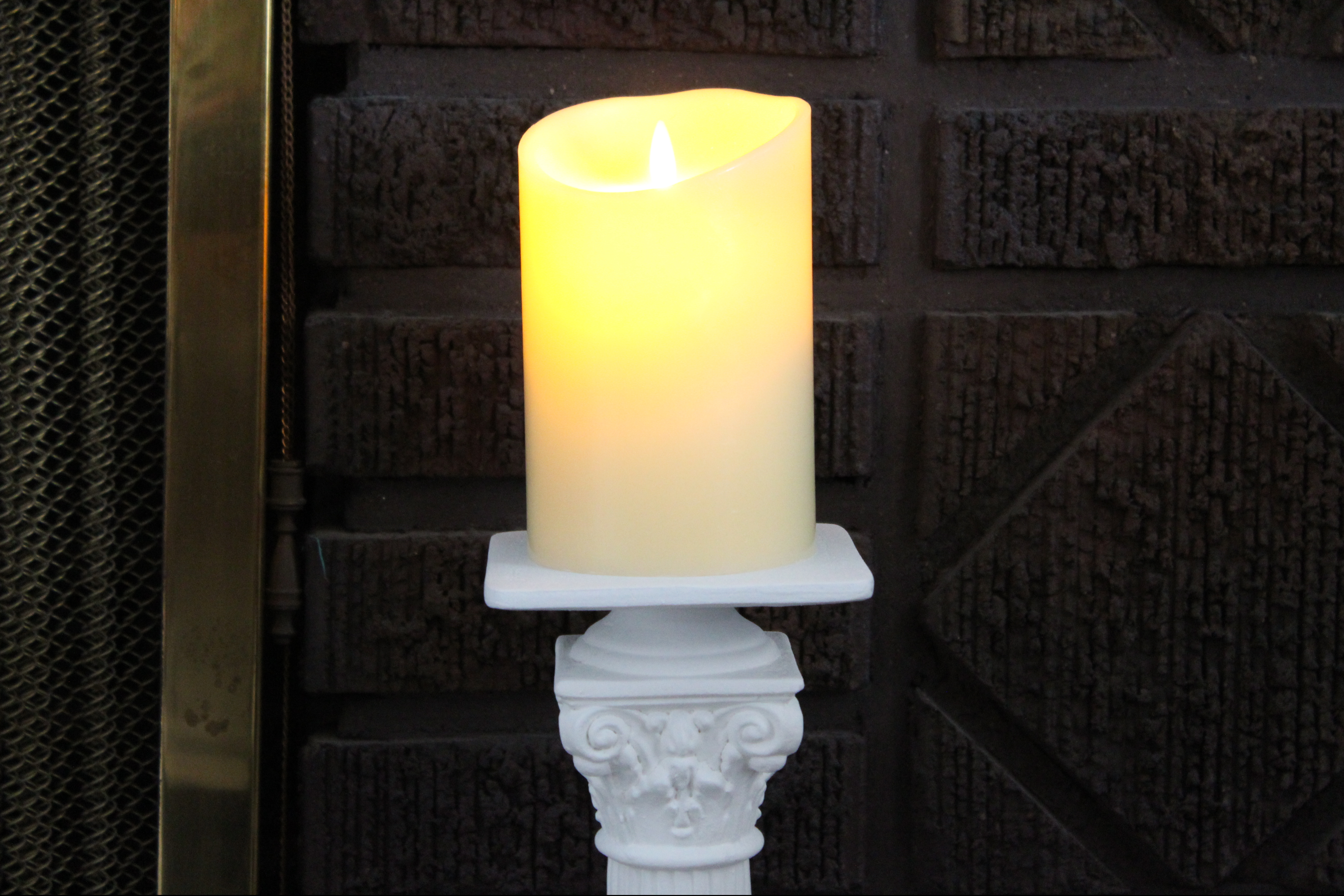 This piece was had casted in 1957. This once was a greenish, yellow discolored lamp that I have repurposed into a gorgeous pillar candleholder. This item is original and adds complete elegance to any room. I have designed a versatile top without a lip to fit more than one size and shape of candle. The top also has a circle cut-out to secure smaller pillar candles and has room for the bottom switch on the battery operated candles.