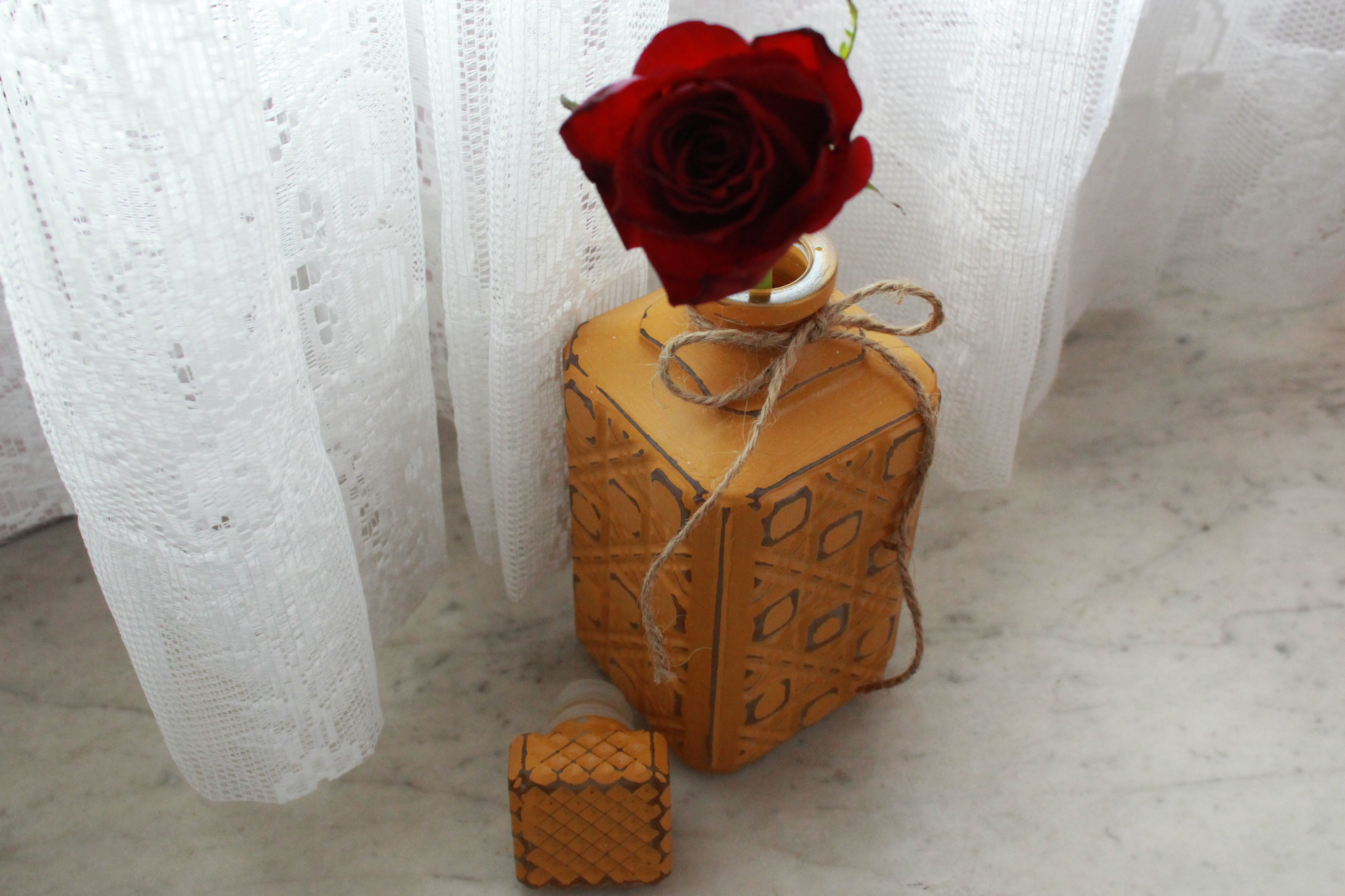 This chalk painted and distressed decanter will add a pop of color to any home. The distressed edges gives you a peak into its crystal body while the color adds complete originality. This versatile piece can be used as is as bar decor, as a vase, candlestick holder or pillar candleholder.
